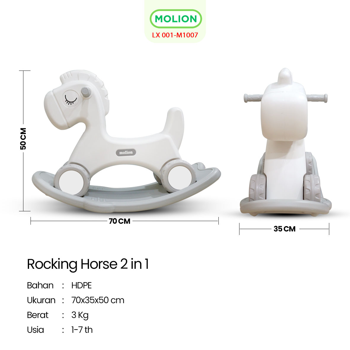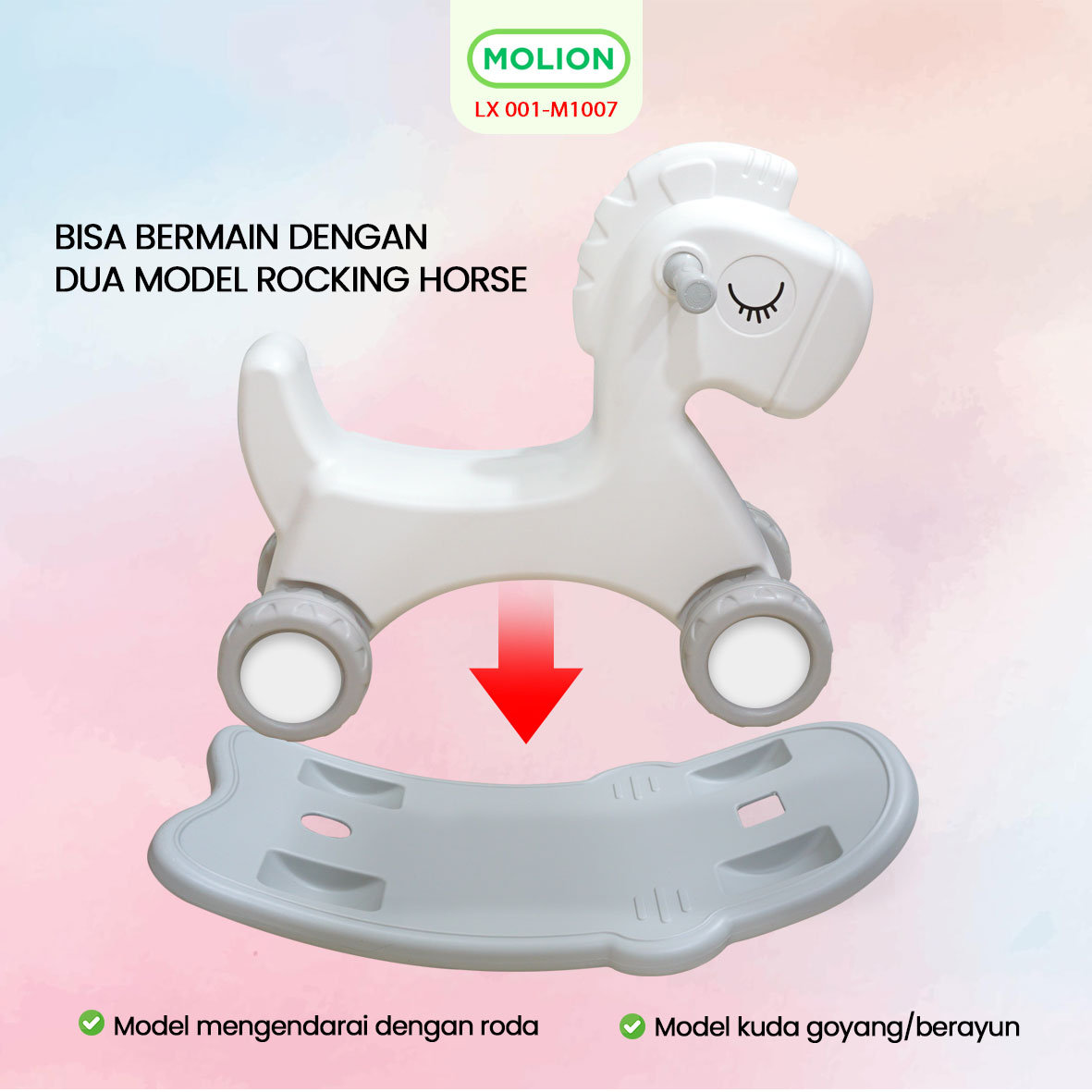 Mainan anak serbaguna yang dapat digunakan dalam dua mode — mode goyang (rocking) dan mode roda dorong (riding). Desainnya yang lucu dan ergonomis membuat anak nyaman saat bermain, sekaligus membantu melatih keseimbangan dan koordinasi motorik.