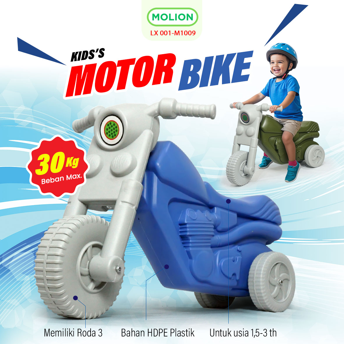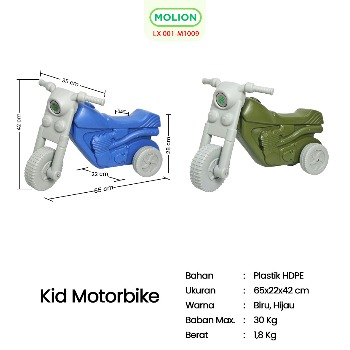 Kid Motorbike adalah mainan motor anak yang dirancang khusus untuk menemani aktivitas bermain si kecil dengan aman dan menyenangkan. Desainnya menyerupai motor sungguhan dengan bentuk yang kokoh, warna menarik, dan ukuran yang pas untuk anak-anak.